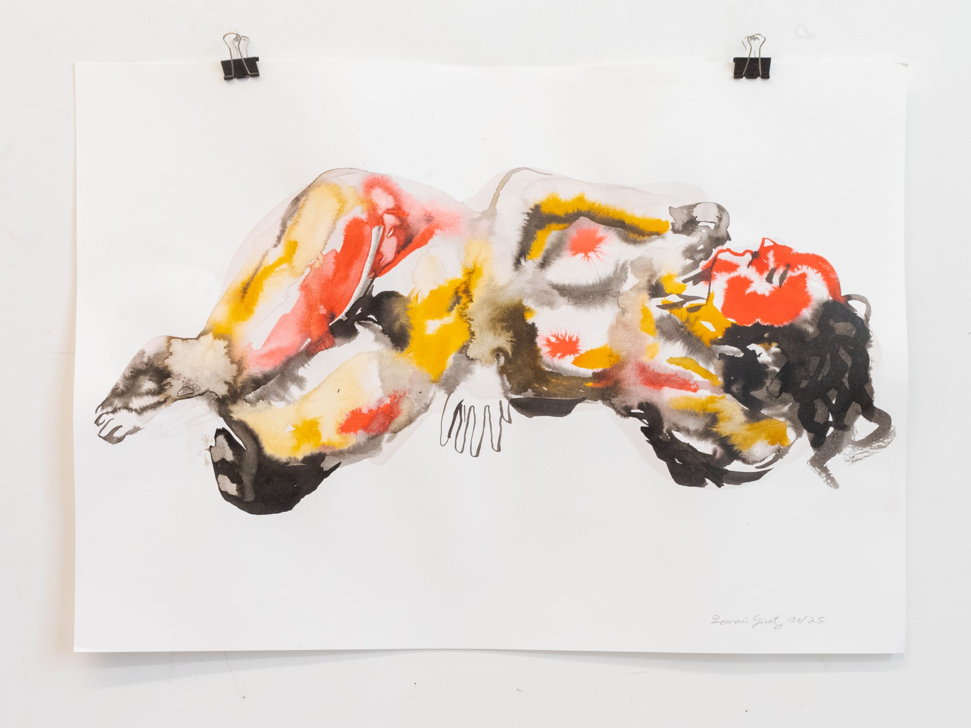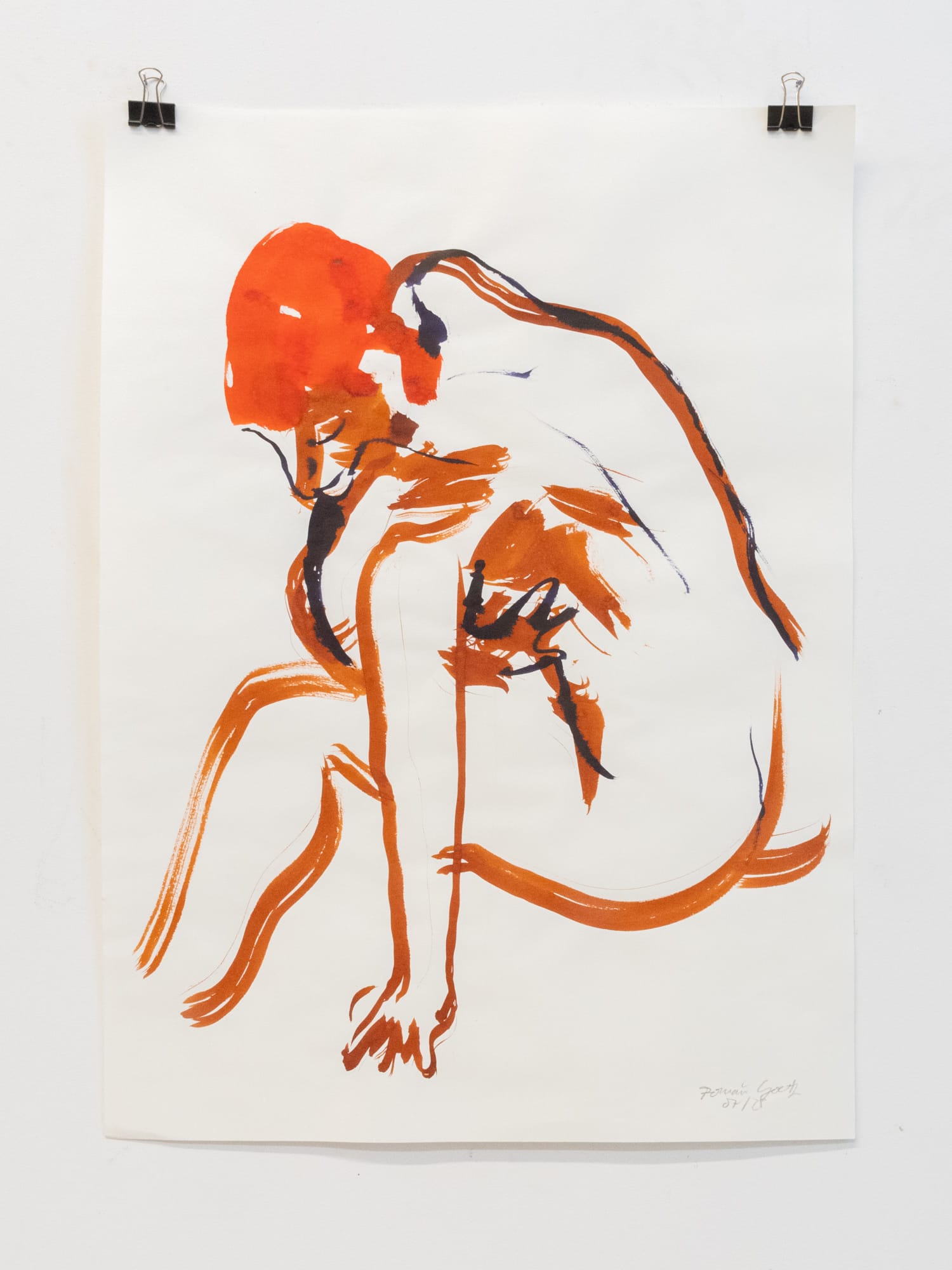 Femme accroupie, encres acryliques sur papier, 41,6 x 57,8 cm, 2025