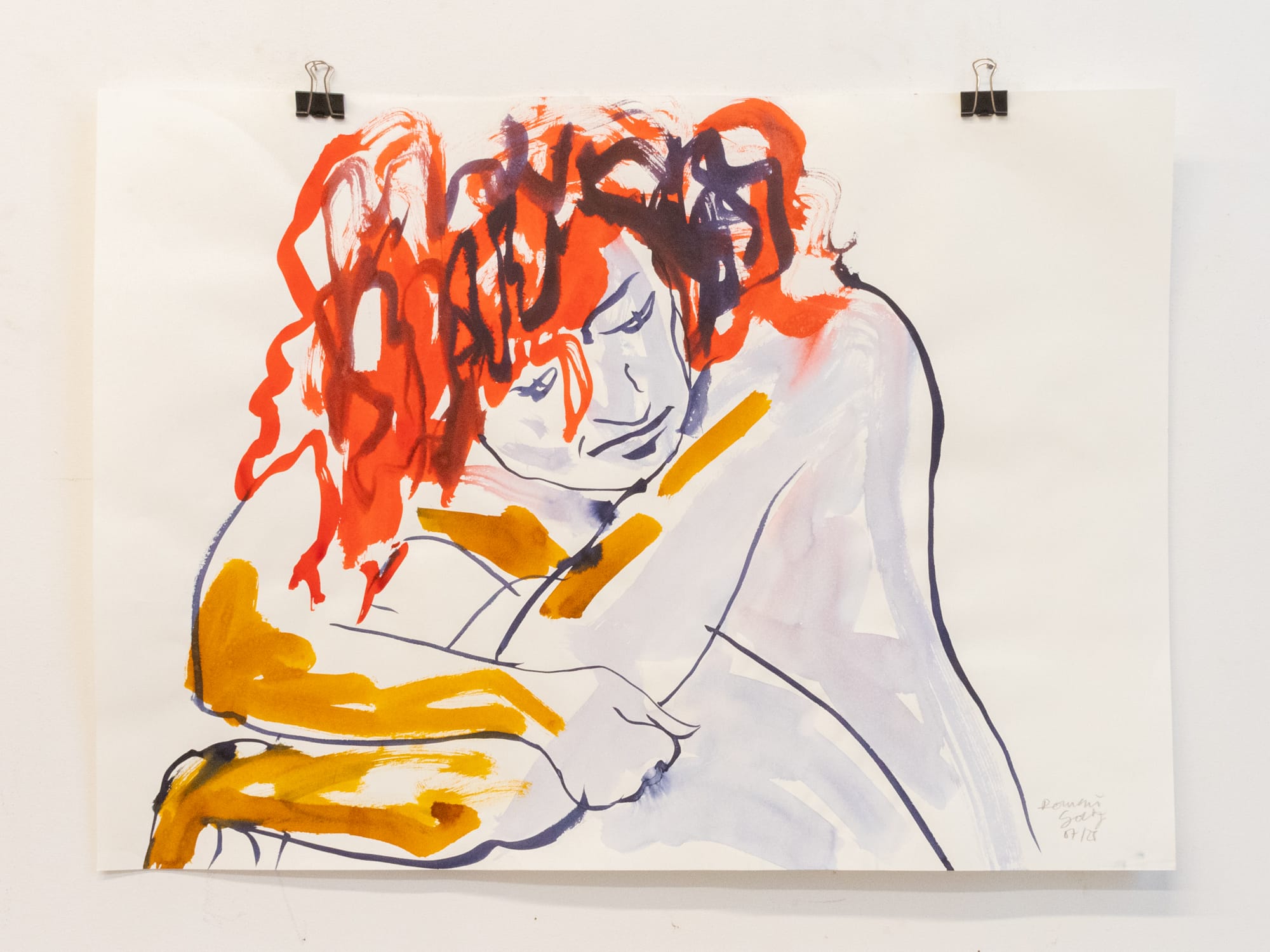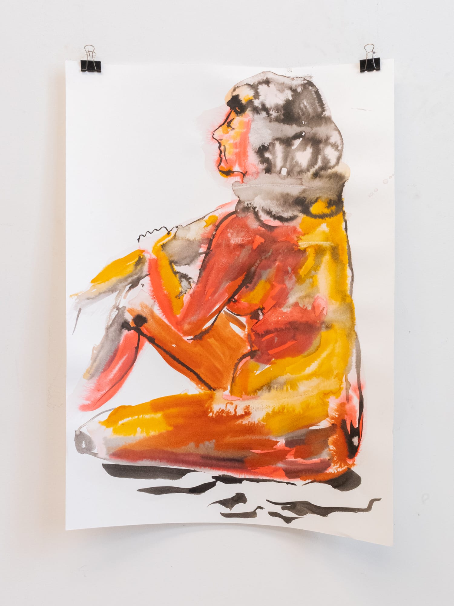 Femme assise, encres acryliques sur papier, 41,8 x 57,8 cm, 2025