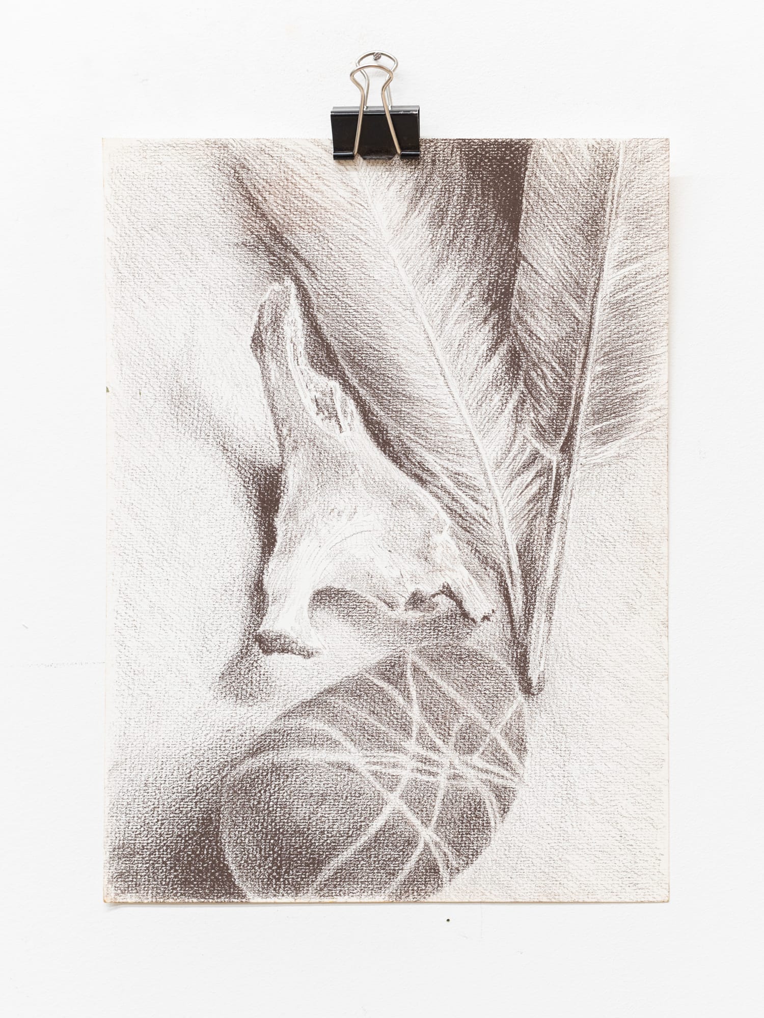Plume, pierre et os, graphite sur papier, 21 x 28,3 cm, 2025