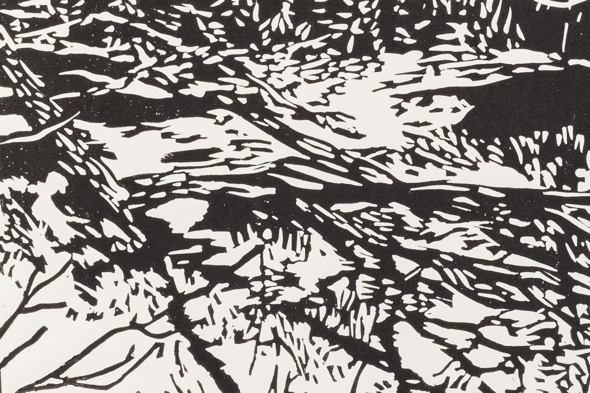 De retour à l’atelier, je replonge dans l’image. Je l’agrandis, je la dessine, je la noircis, je cherche à retrouver cet espace liminal, périphérique, indéterminé. Retrouver le chatoiement, la possibilité d’une vision double ou plurielle : entre ce qui est visible, l’eau elle-même, ce qui se reflète dans l’eau, ce qui est sous l’eau et qui transparaît, ce qui sort de l’eau. Je transfère le dessin sur une plaque de linoléum que je grave. Je creuse la plaque à la recherche des lumières. Chaque retrait est un peu de blanc qui s’ajoute.