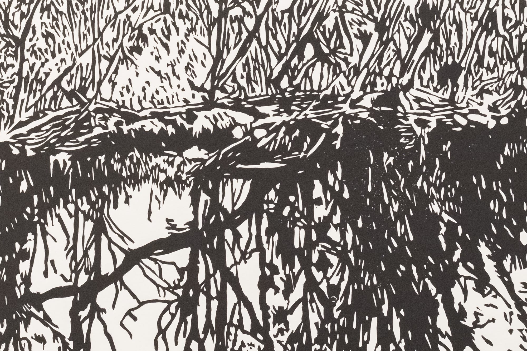 De retour à l’atelier, je replonge dans l’image. Je l’agrandis, je la dessine, je la noircis, je cherche à retrouver cet espace liminal, périphérique, indéterminé. Retrouver le chatoiement, la possibilité d’une vision double ou plurielle : entre ce qui est visible, l’eau elle-même, ce qui se reflète dans l’eau, ce qui est sous l’eau et qui transparaît, ce qui sort de l’eau. Je transfère le dessin sur une plaque de linoléum que je grave. Je creuse la plaque à la recherche des lumières. Chaque retrait est un peu de blanc qui s’ajoute.