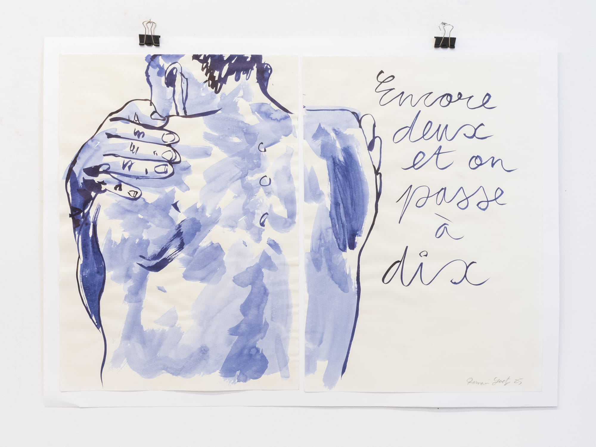 Encore deux et on passe à dix, encre indigo sur papier, 64 x 46 cm, 2025