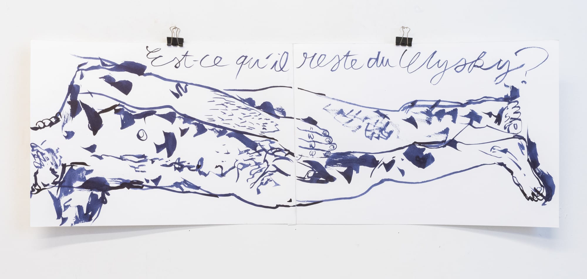 Est-ce qu'il reste du Wysky ?, encre indigo sur papier, 82 x 29 cm, 2025
