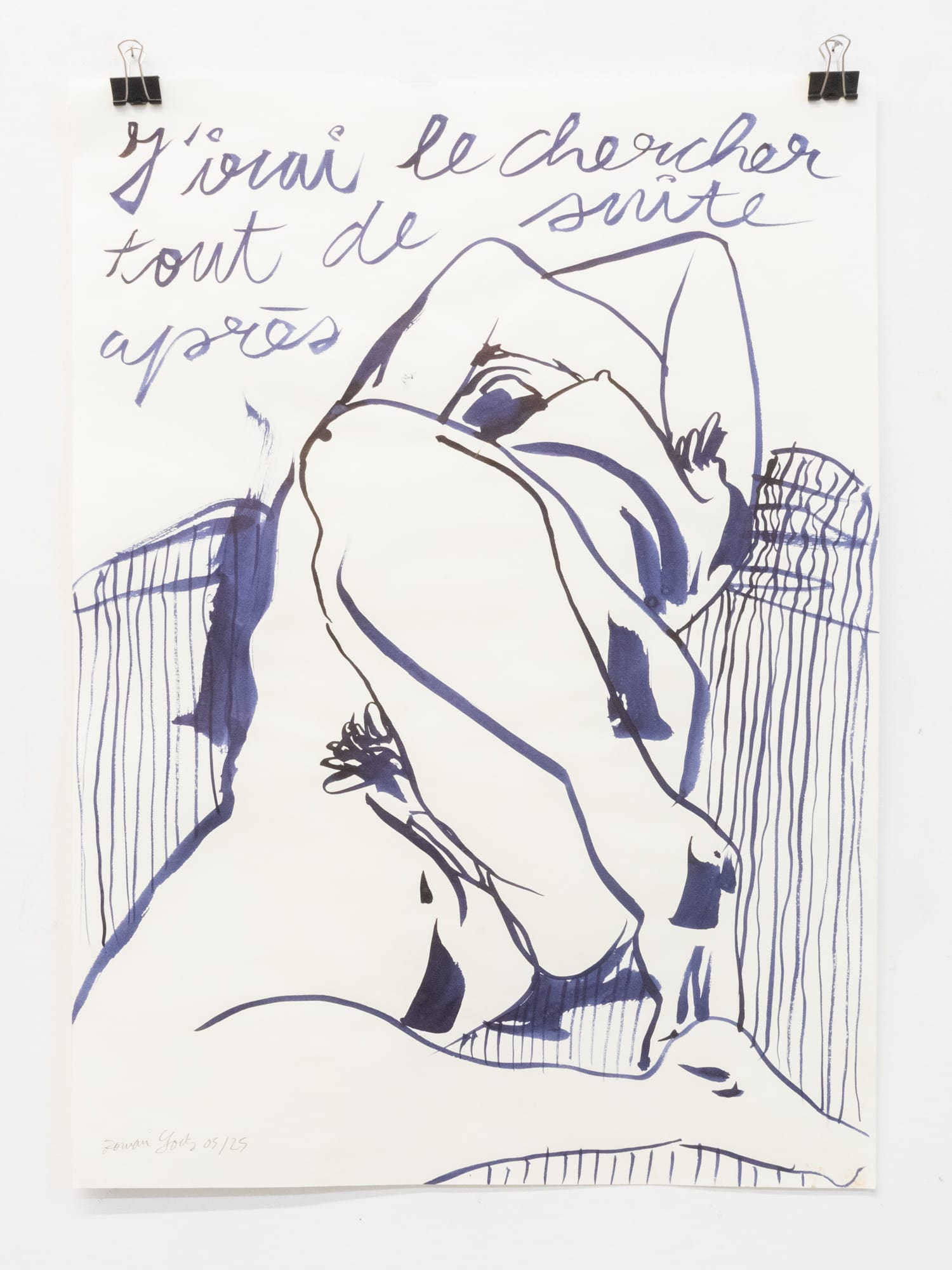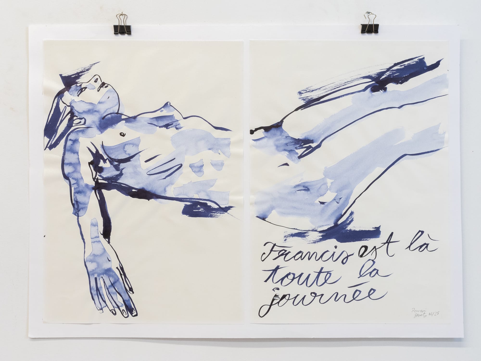 Francis est là toute la journée, encre indigo sur papier, 64 x 46 cm, 2025