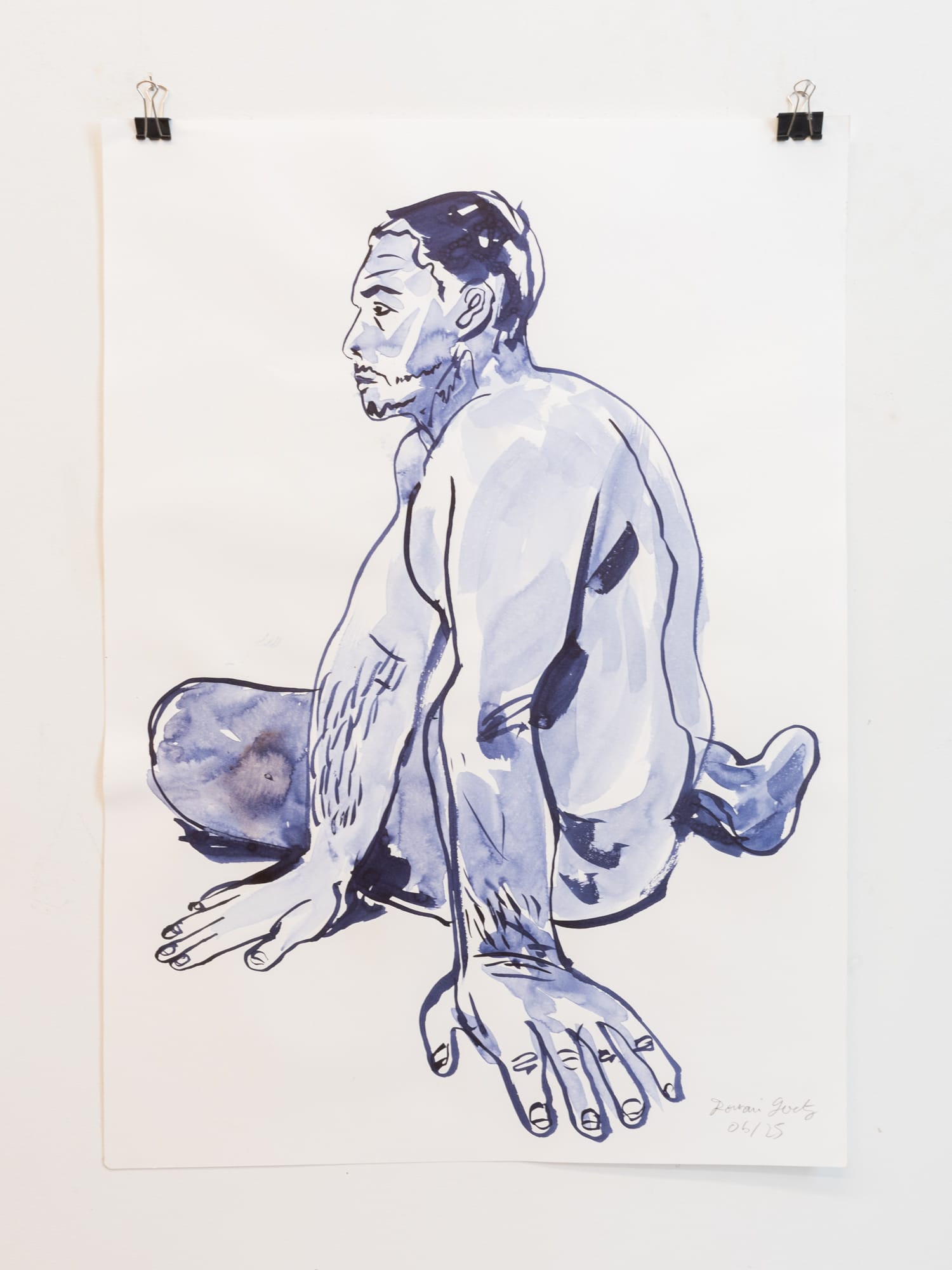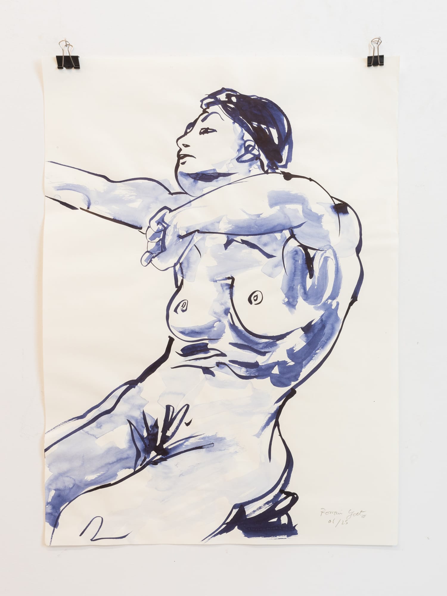 Femme assise, encre indigo sur papier, 64 x 46 cm, 2025