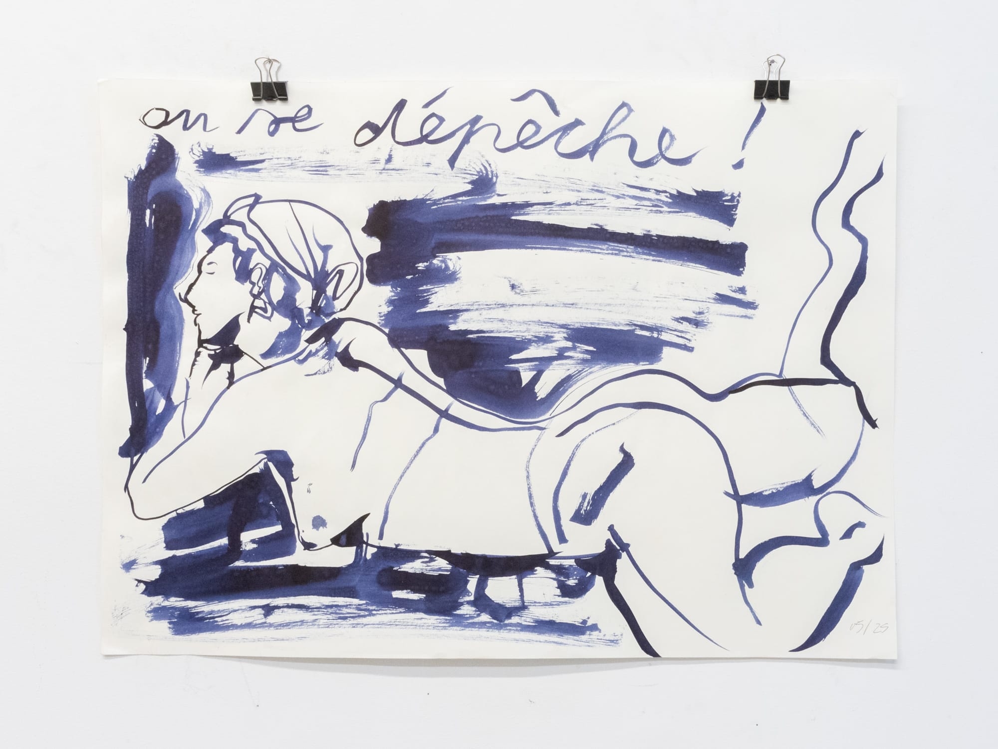 On se dépêche, encre indigo sur papier, 41,8 x 57,8 cm, 2025