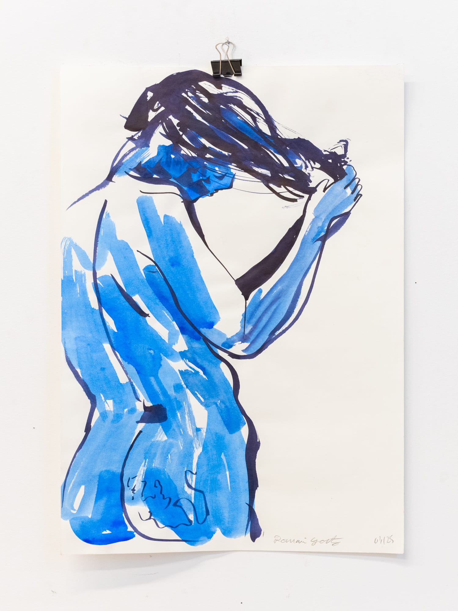 Femme aux cheveux, encre indigo et bleue sur papier, 28 x 42 cm, 2025