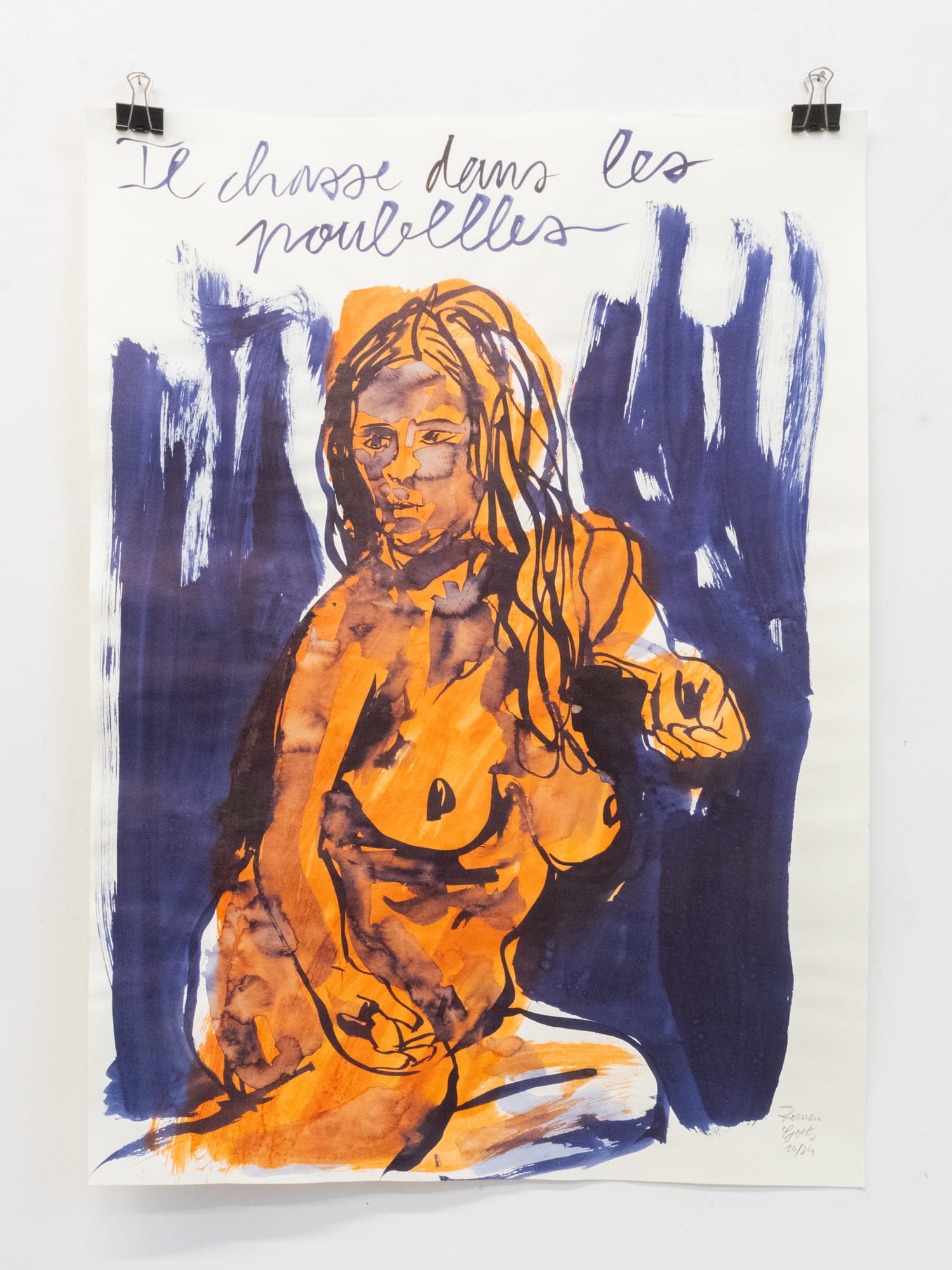 Il chasse dans les poubelles, encres acryliques sur papier, 41,8 x 57,6 cm, 2024